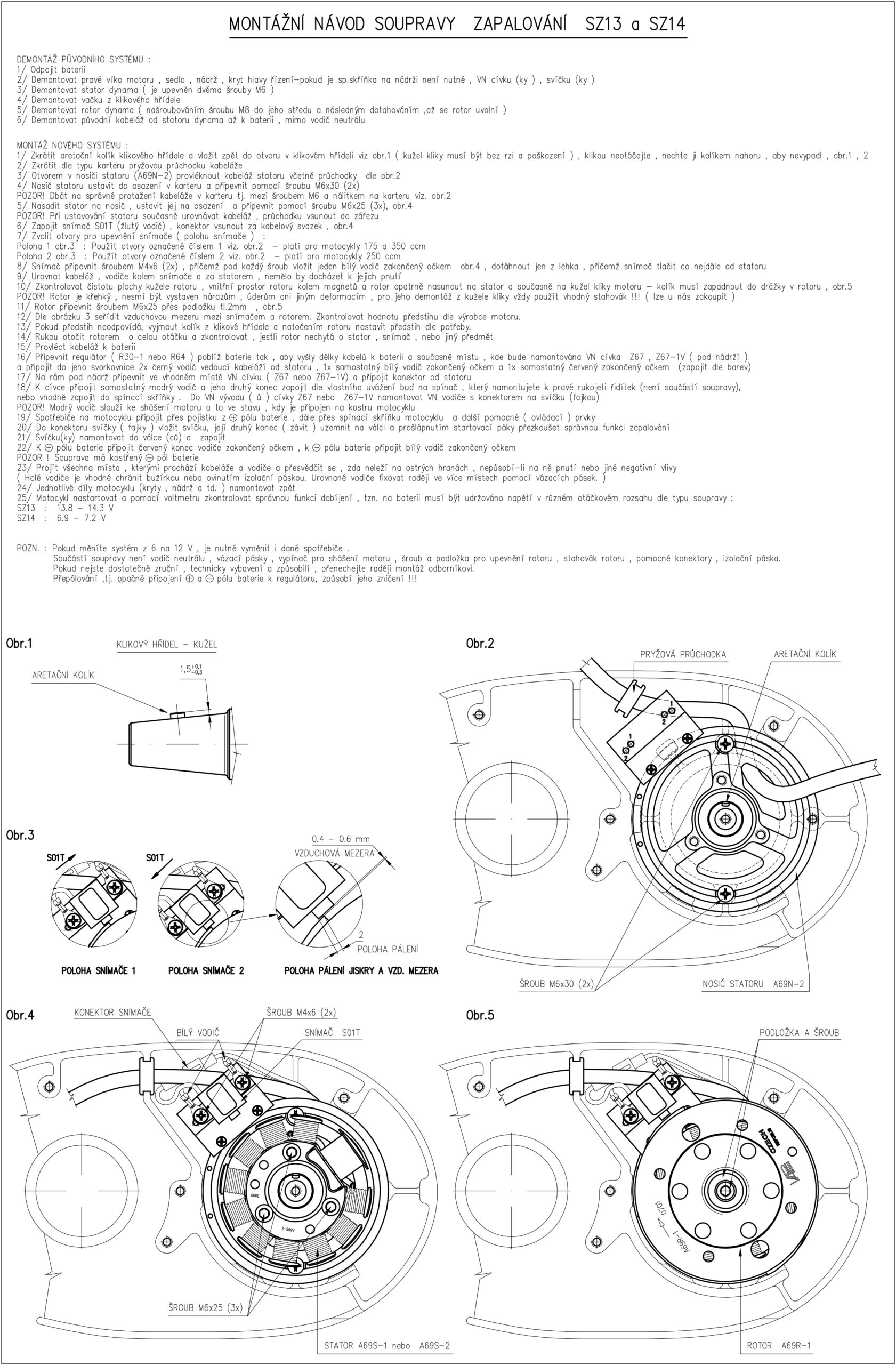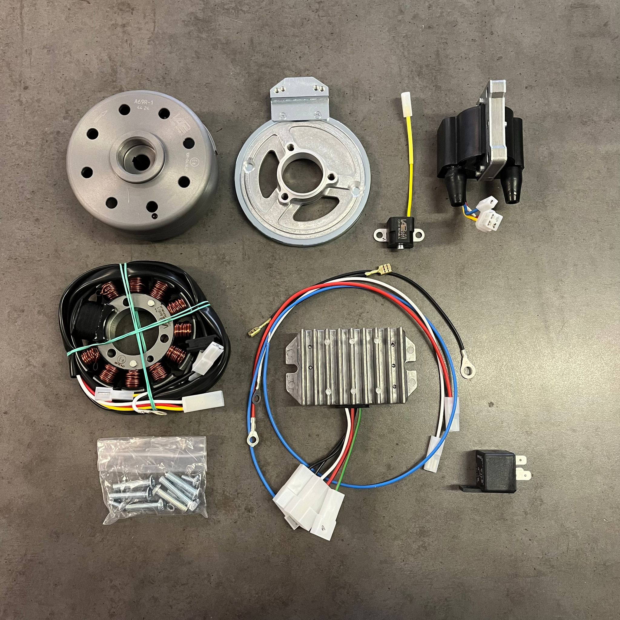 Sada obsahuje stator s cívkami a snímačem, rotor, veškeré držáky pro montáž, usměrňovač napětí, rozpínací relé, vysokonapěťovou cívku a podrobný návod v českém jazyce.