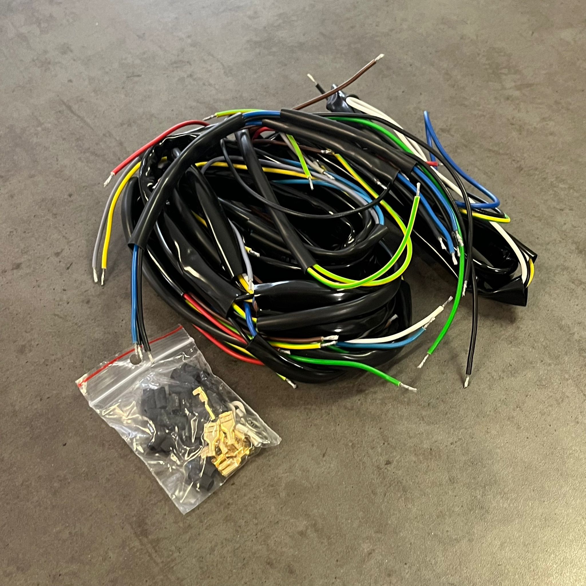 Kompletní elektroinstalace pro všechny elektrické součásti motocyklu, precizně vyrobená podle původního originálu. Použitá lanka mají průřez 1,5 mm, doplněná o bužírky o průměrech 4, 6 a 10 mm. Balíček obsahuje také přehledné schéma zapojení, které vám usnadní instalaci.