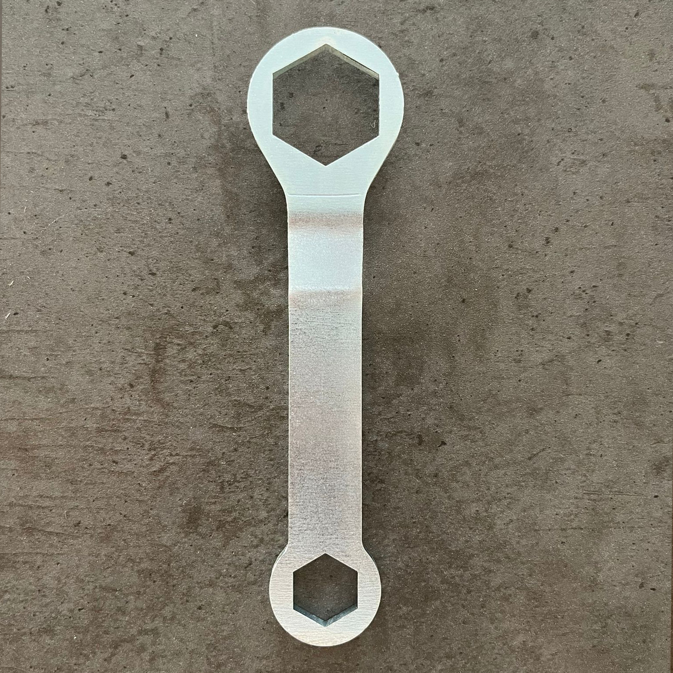 Tento klíč je pečlivě navržen tak, aby perfektně pasoval na matice kol a rozety u motocyklů Jawa 50 Pionýr typ 05/20/21/23 . Byl součástí originálního nářadí. Klíč je vyrobený z kvalitního materiálu a opatřen povrchovou úpravou zinku, která zajišťuje odolnost proti korozi. S celkovou délkou 168 mm a rozměry pro matice 17/27 mm, tento klíč poskytuje optimální páku a snadné použití.