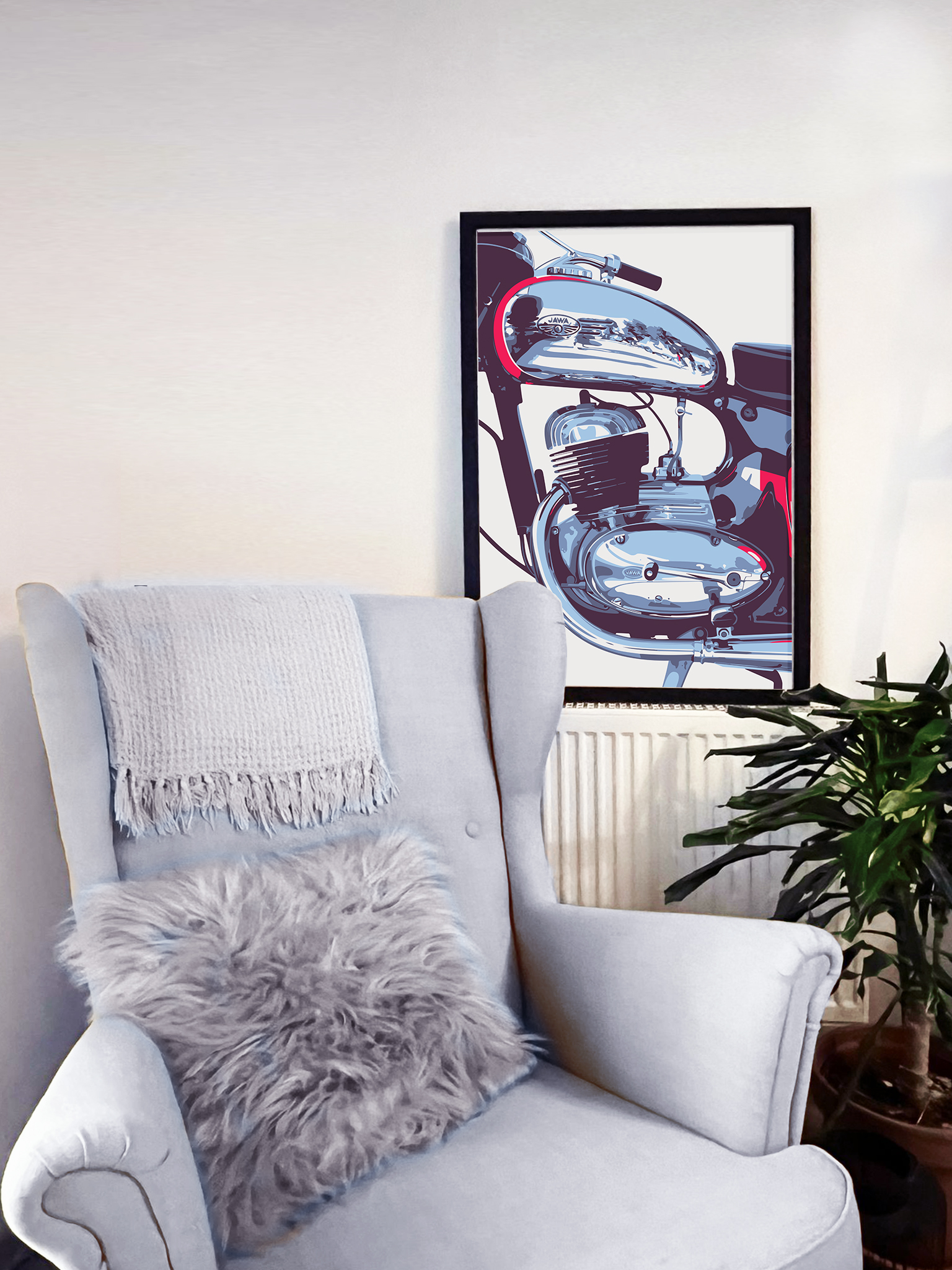 Představte si, jaký dojem by udělal tento nádherný MOTOPLAKÁT – MOTOR JAWA 250 PANELKA na stěně vaší dílny, bytu nebo kanceláře. Tento výjimečný produkt není jen obyčejným plakátem, je to kousek historie a vášeň pro motocykly zachycená v umělecké podobě. Plakát vznikl v autorské dílně Malá bulgarinka v rámci projektu Motoplakáty.