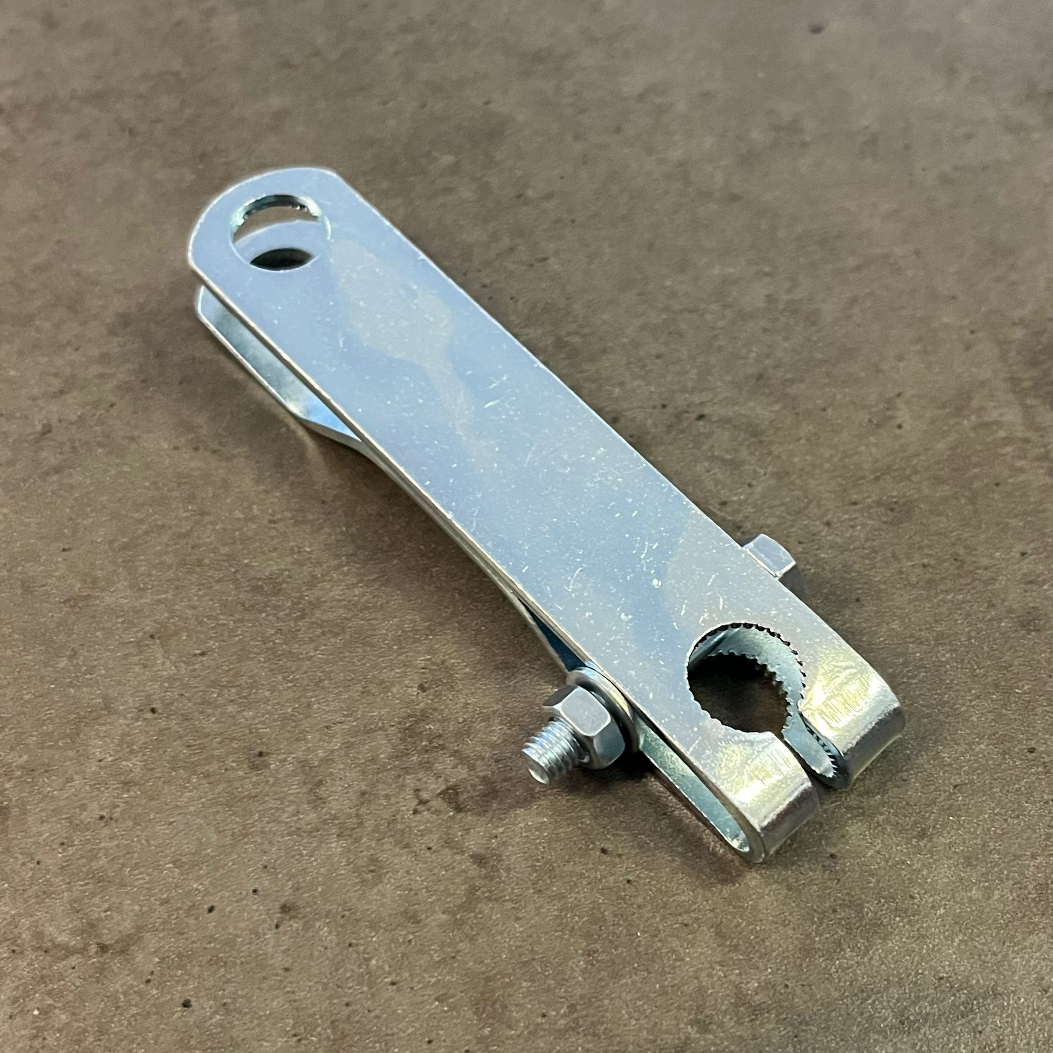 Páka brzdového štítu aktivuje zadní brzdové lanko, které následně otáčí brzdovým klíčem uvnitř brzdového bubnu. Tento klíč pak roztahuje brzdové čelisti, čímž zajišťuje účinné zpomalení nebo zastavení motocyklu. Pro dlouhou životnost a ochranu je páka opatřena kvalitní povrchovou úpravou v zinku.